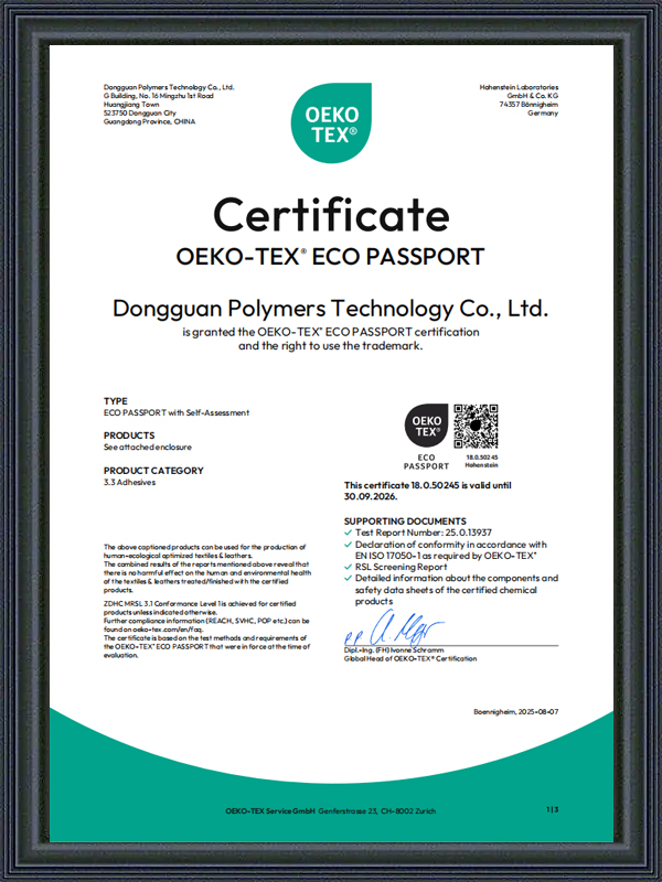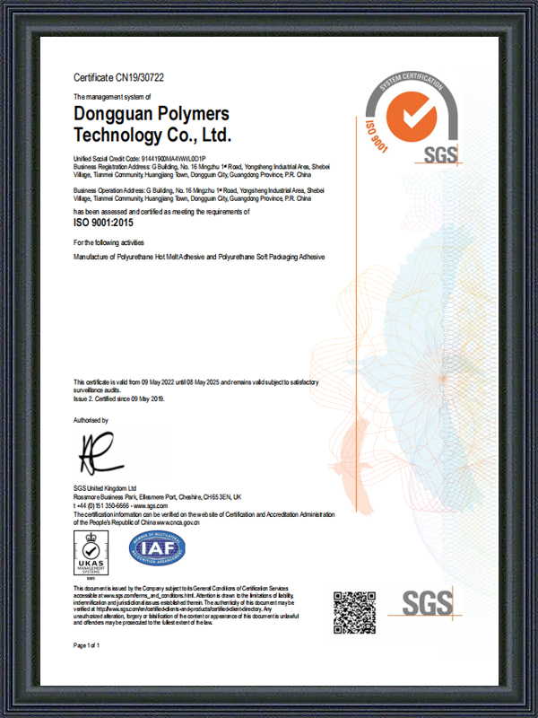 2018PU adhesive正式投产;通过SGS 9001:2015认证。